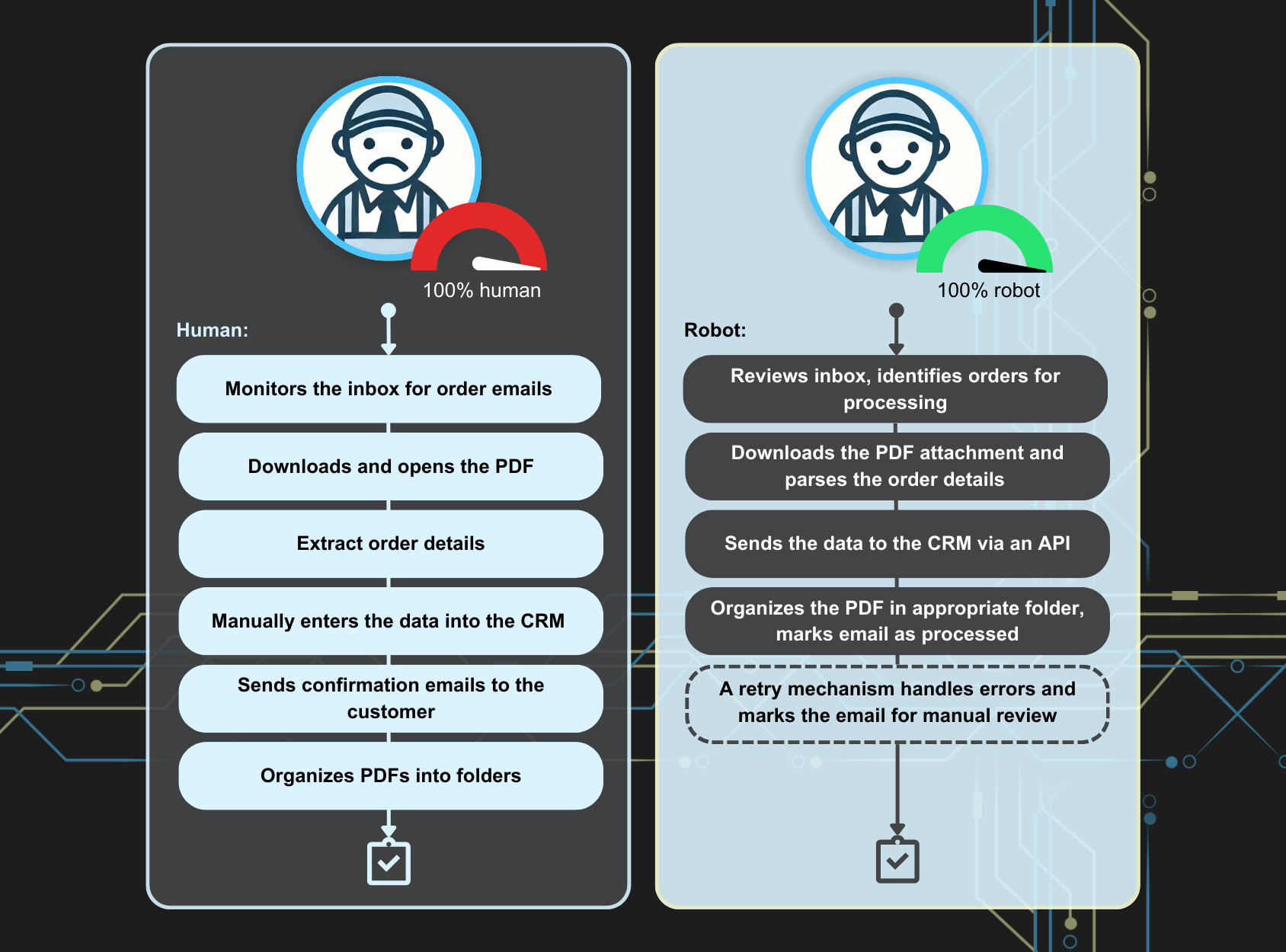 Instead of requiring an employee to manually enter data, the robot processes the order details and sends them directly to the CRM, ensuring accuracy and eliminating delays. Once processed, the system organizes the PDF in the appropriate folder and marks the email as completed, maintaining a structured workflow.