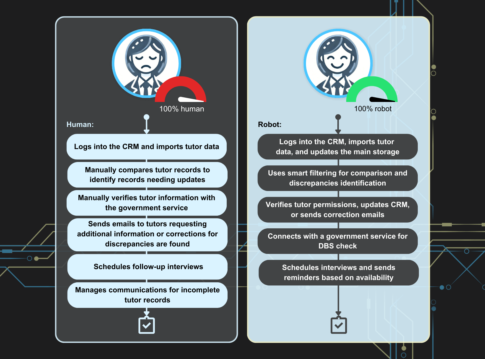 Verification is no longer a bottleneck, as the system checks each tutor record for the required permissions. If any discrepancies arose, the automation sent emails requesting updated information. Adding to the value, the implemented solution connects directly to a government service GOV.UK for DBS checks.