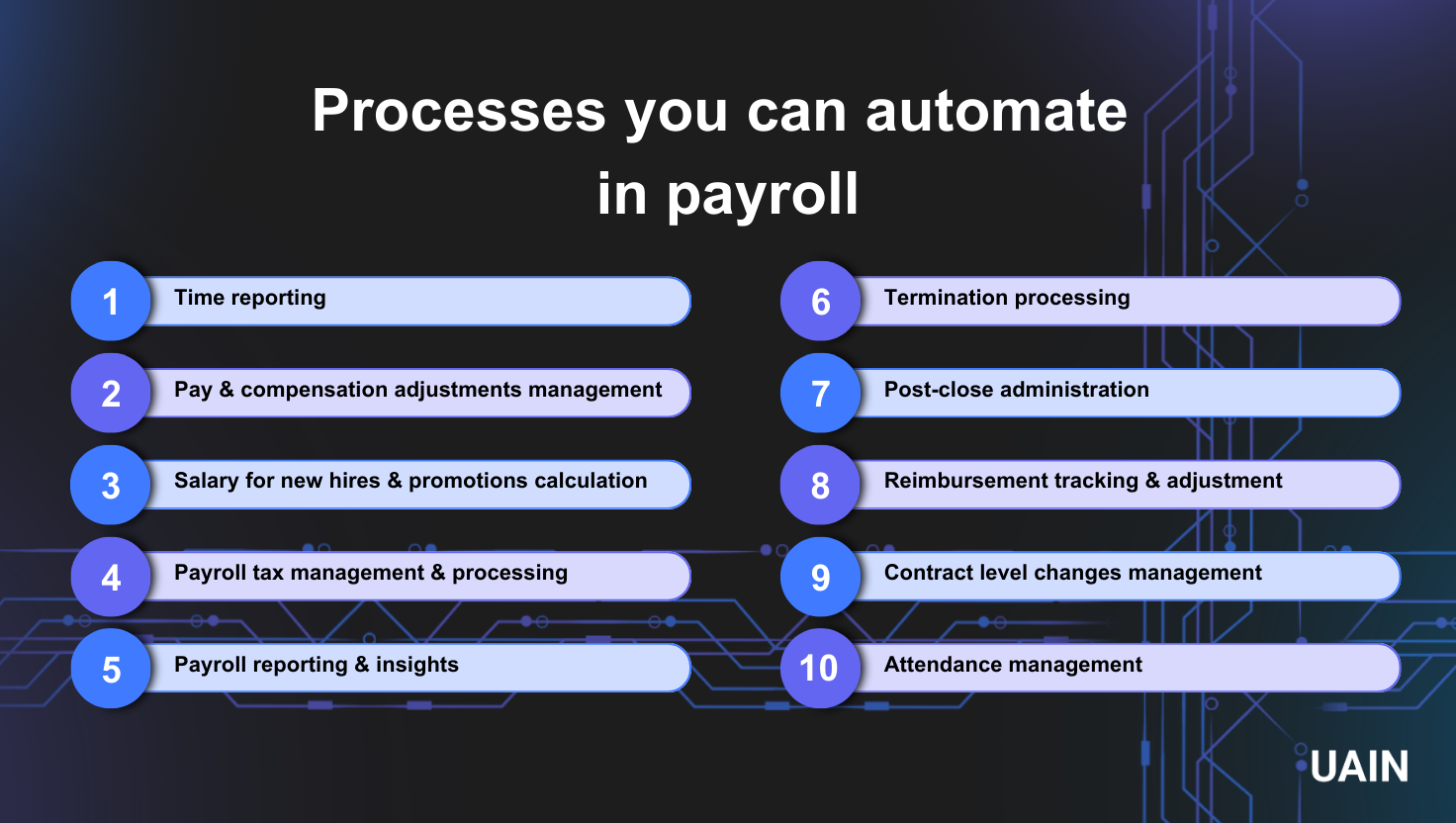 Intelligent automation, leveraging RPA and AI, brings flexibility and efficiency to payroll management. It can automate tasks across the entire payroll cycle. Here are some processes that can benefit from automation.